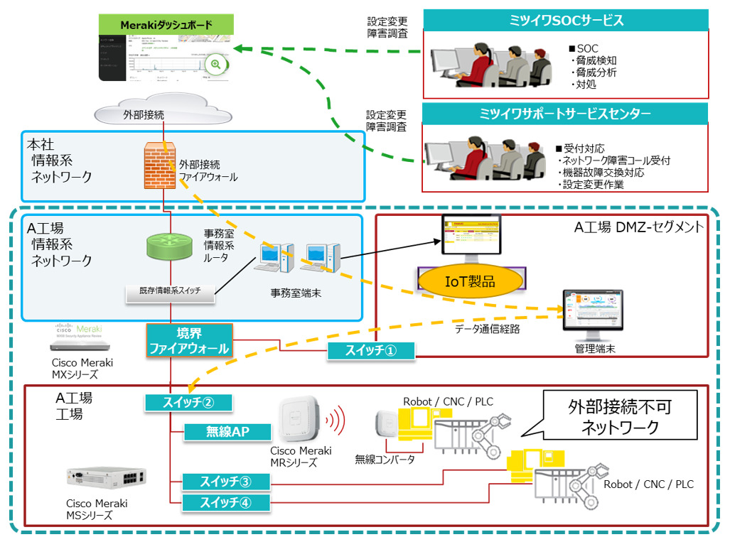 そこで、ミツイワでは境界ファイアウォールを採用することで、工場を外部のネットワークから遮断し工場内のOTネットワークとITネットワークを安心・安全に接続できるネットワーク環境を、オールインワンのサブスク型のマネージドサービス「Mitsuiwa Meraki® Managed for Factory」としてご提供。お客様の各種の不安を解消しつつ、工場内の各種データを利活用した予知保全や異常検知、設備診断などスマートファクトリー化の推進を支援いたします。シスコテクノロジーの強みを最大限に引き出したマネージドサービスなので、お客様に導入から運用までの数々のステップを気にしていただく必要はなく、工場内へのネットワーク環境導入のハードルを大幅に引き下げました。