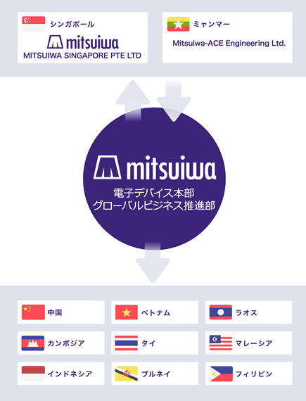 半導体市場が活況を呈し、日本の企業が安価な労働力を求め、生産拠点をASEAN各国に展開しつつあった1997年、電子デバイス事業における顧客との緊密な連携を強化するため、ミツイワにとって初の海外拠点となるミツイワシンガポールを設立しました。また、中国市場においては、2003年に設置した中国ビジネス推進室を起点に多くのお客様の中国進出を支援してきました。