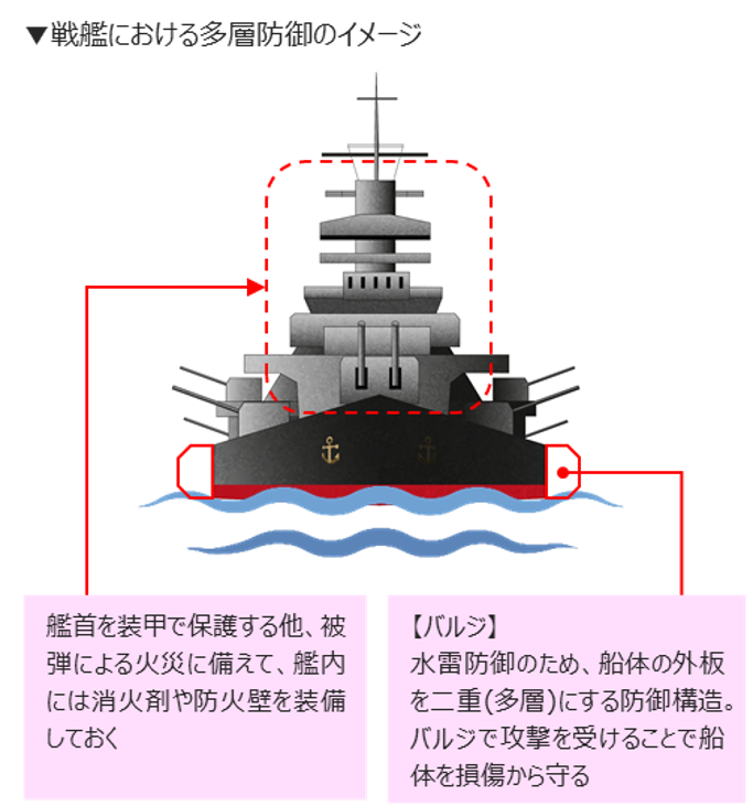 近年、サイバー攻撃の手法が多様化しており、リスク低減の対策として多層防御が求められています。多層防御とは、守る対象(情報資産)に対し、複数のディフェンスライン(層)を構成し、セキュリティ対策を講じることです。例えば戦艦では、空爆や砲撃への対策として、艦首を装甲で固める(第一層)ほか、艦内に防火壁を備えています(第二層)。万一、砲撃によって艦首を突破され、艦内に火災が広がったとしても、防火壁により被害の拡大を食い止め、攻撃の完全突破を防ぐことができます。