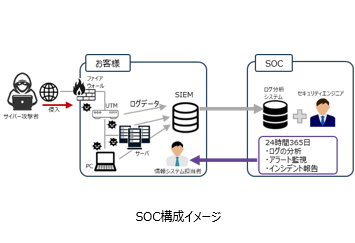 SOCの監視範囲は、お客様環境にあるセキュリティ機器 (FW,IDP/IPS,WAF,ウイルス対策ソフト等)やネットワーク機(ルーター,スイッチ,ブリッジ等)、サーバ(メールサーバ,認証サーバ,プロキシサーバ等)が対象となります。