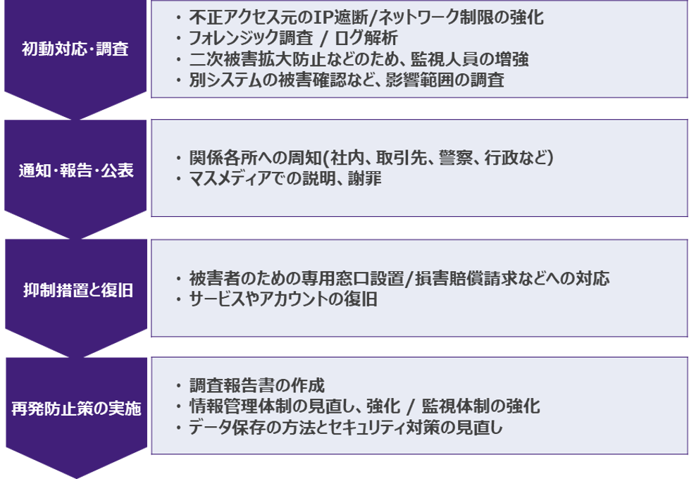 上記の表のように、初動対応から事後対応に伴う社内リソースの逼迫、サービスの長期停止や社会的信用の低下による売上減少など、様々な損失を誘引し、最悪の場合には、倒産など、取返しのつかない被害に発展するリスクを孕んでいます。