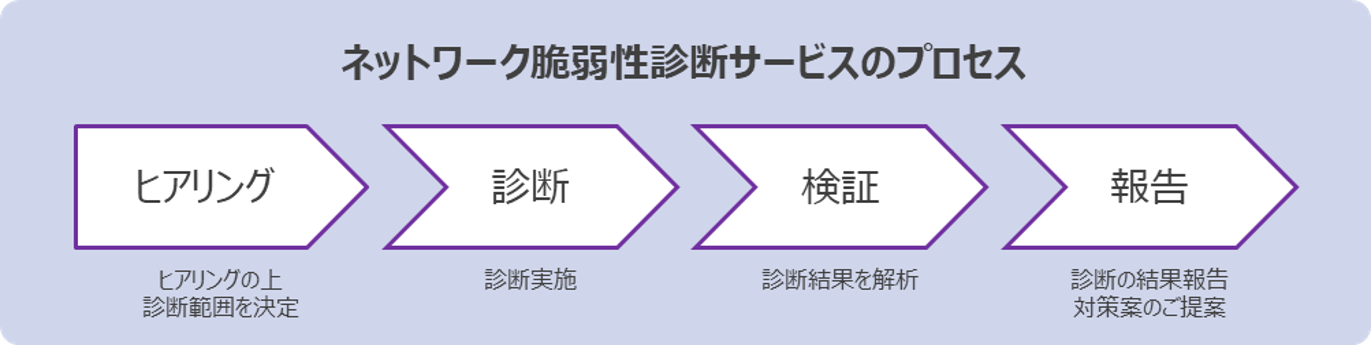 不正アクセス対策のためには、まず、自社のネットワークのどこに脆弱性があるかを知ることが大切であり、セキュリティベンダーなどが提供するネットワーク脆弱性診断サービスをご利用いただくことが有効です。
