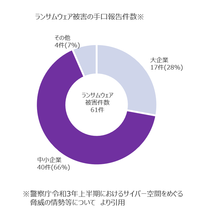 被害件数の内訳を企業の規模別にみると、大企業よりも中小企業の方が多く、企業規模を問わず被害が発生しています。