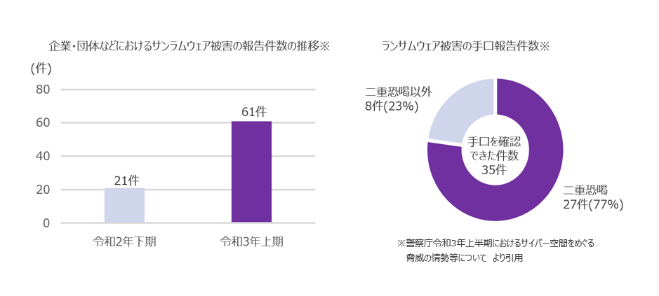 感染した端末のデータを暗号化し金銭の要求を行うランサムウェアの被害件数が急増しています。 令和3年上半期に都道府県警察から警察庁に報告のあった件数は61件で、昨年下期の21件と比べて3倍も増加しました。 また、ランサムウェアの特徴も変わってきています。データを暗号化しデータを搾取したうえ金銭の要求を行うだけでなく、情報の公開をネタに金銭の要求を行う、二重恐喝(ダブルエクストーション)という手法が発生しています。中小企業が主なターゲットに