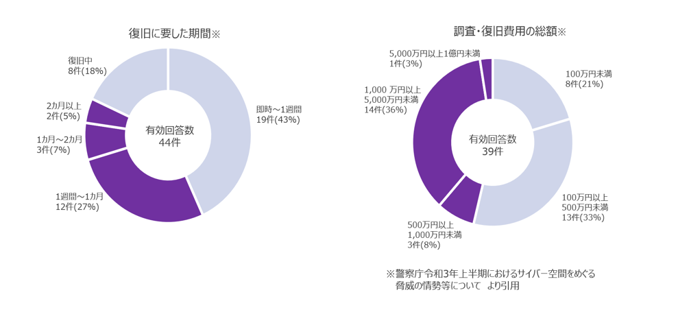 警察庁の調査によると、ランサムウェアの影響を受けた企業のうち復旧に1週間以上かかっている企業は半数以上を占めており、中には2か月以上要した事例もあります。また、約3割の企業で1,000万円以上の調査・復旧費用が発生しています。漏えいした情報(財務情報、顧客情報)は、ダークウェブ上にあるリークサイトでの公開や、オークションサイトで不正に販売取引されています。