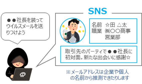 | なりすまし | 社員や取引先を装って、標的の情報を盗み出すこと 他人のアカウントで、システムなどに不正にアクセスすること |
