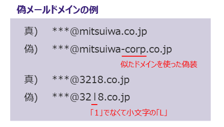 なりすましには多要素認証、BECであれば、メールドメインの確認(右記)など、細やかな対策をあげれば枚挙にいとまがありませんが、これらの対策をケース別に丸暗記をすることは現実的ではないでしょう。被害を防ぐためには、情報セキュリティ専門の組織をつくり、全社的にセキュリティ対策に取り組んでいくこと、教育や演習などを通して、経営層、社員、アルバイトなど組織を構成するメンバーに対し、セキュリティの意識づけを継続していくことがもっとも重要です。