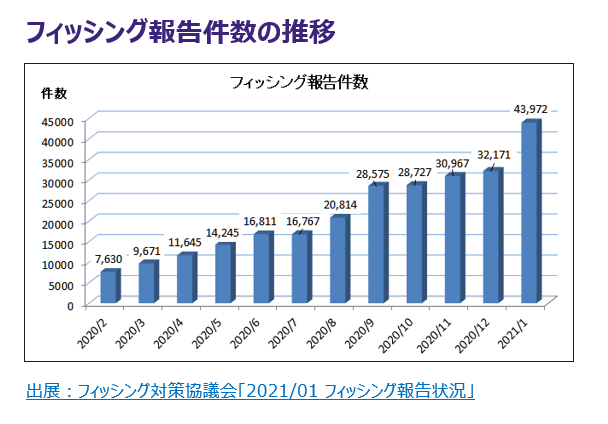 ソーシャルエンジニアリングは、本命の攻撃を仕掛けるための情報窃盗を目的とする場合が多く、ターゲットとする情報が盗み出されると、不正アクセスやマルウェア攻撃、機密情報流出の二次的被害に繋がります。事例ベースでは、例えば、2021年1月のフィッシングの月次報告件数が、集計開始以来初となる4万件を超え、なおかつ1年前(2020年2月)と比較して6倍近くになるなど、その被害は増加傾向にあります。