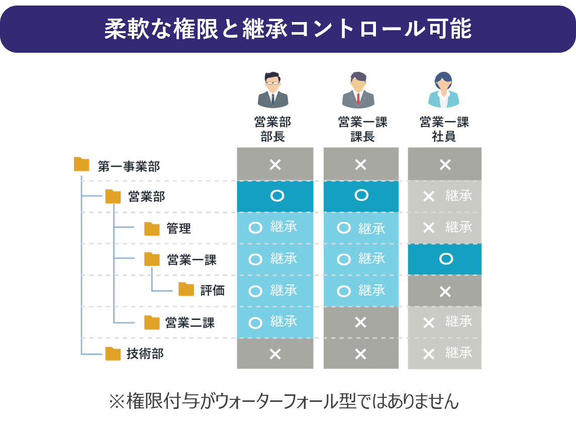 フォルダごとに権限付与が可能なのはもちろんのこと、管理権限の譲渡が可能なので、組織構造にあわせて権限管理することが可能です。