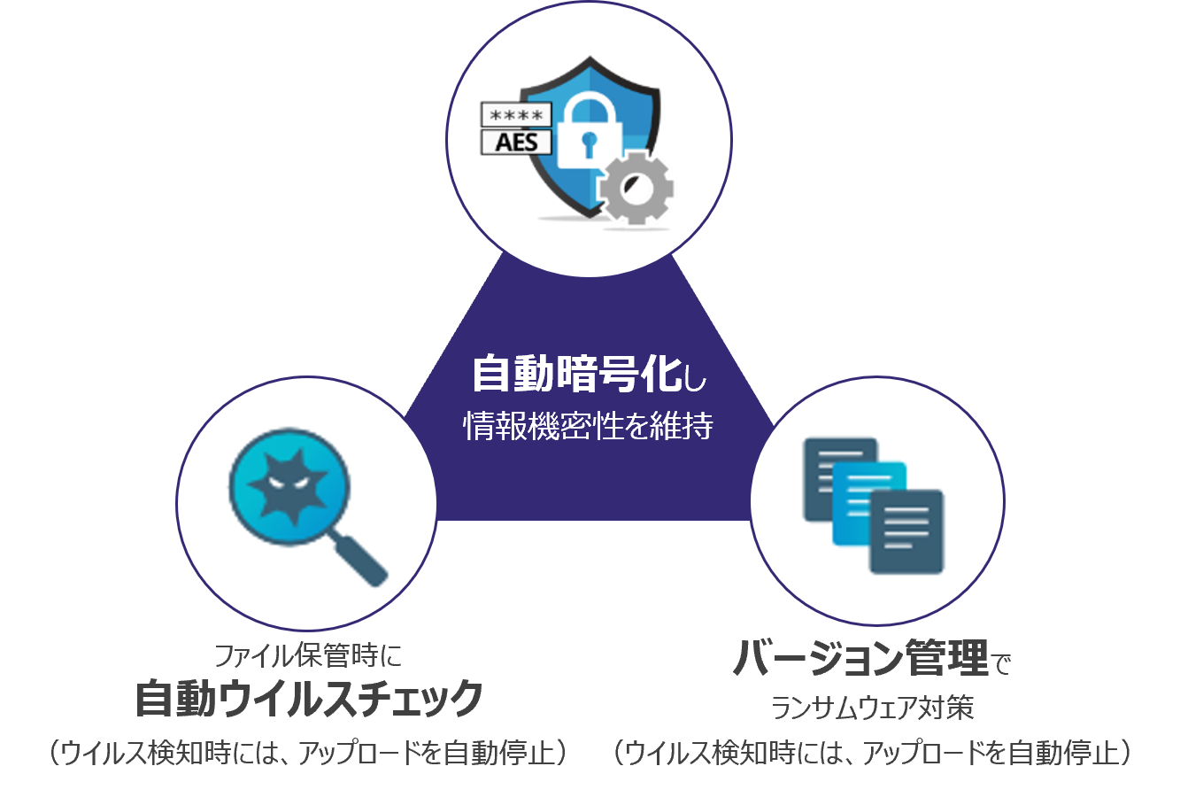 また、ファイル保管時には自動でウイルスチェックを実施し、問題のあるファイルが拡散する危険を未然に防ぎます。