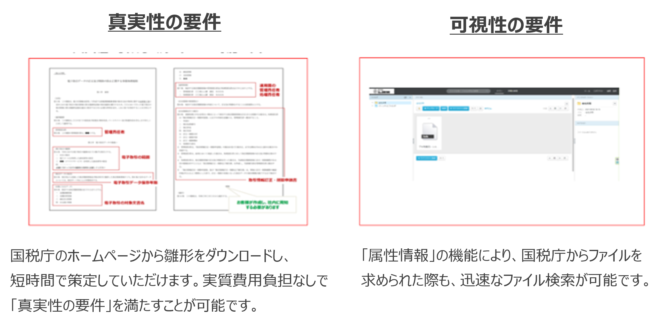おてがる!コワークドライブは、そのままでも改正電帳法の「可視性の要件」を満たしているので、「真実性の要件」を満たす改ざん防止等のための事務処理規定を策定して運用するだけで費用を抑えて電帳法対策を実現することが可能です。