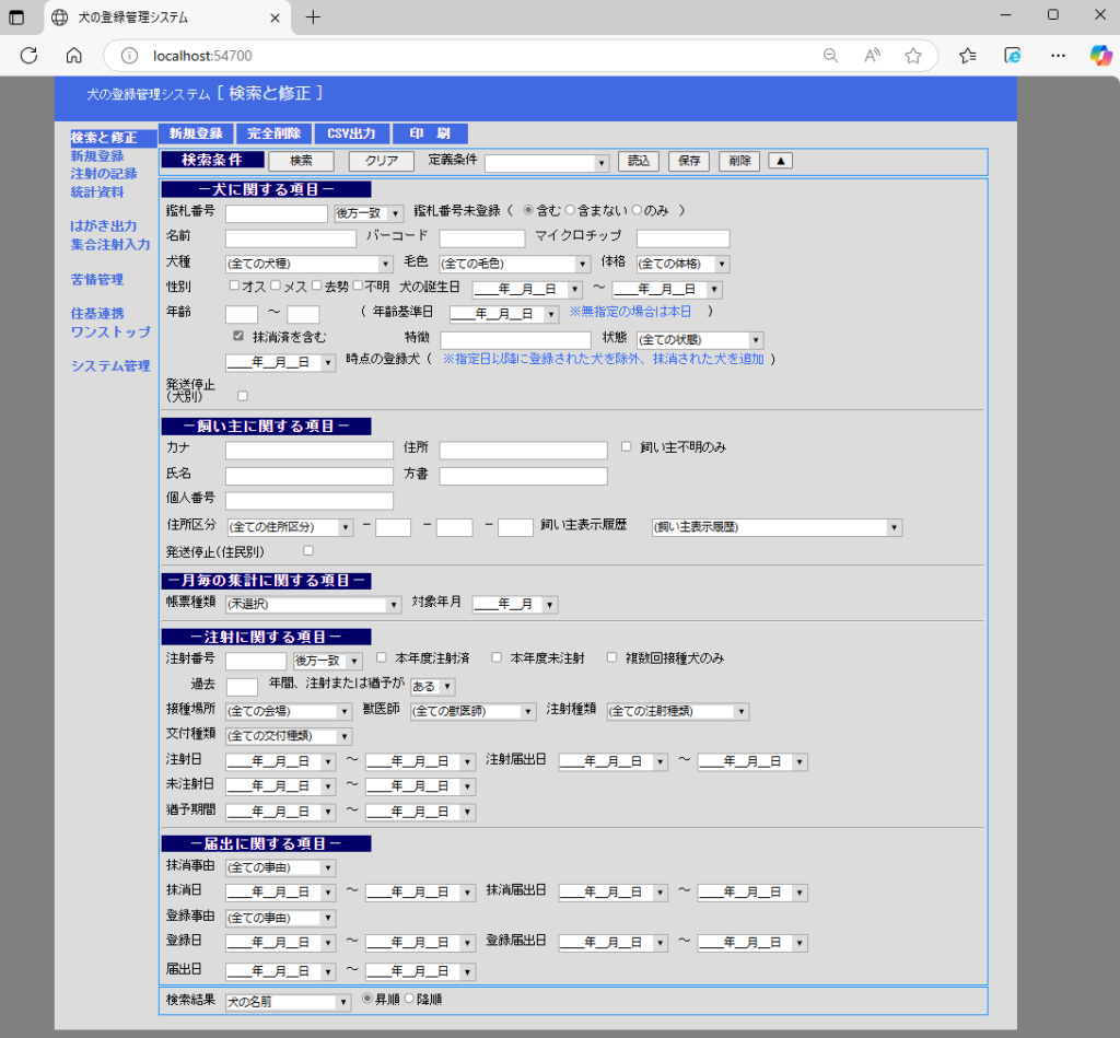 ログイン後、最初に表示されるページがこちらの検索画面です。各種の検索条件を入力することで、お探しの飼い犬の記録を検索いただけます。