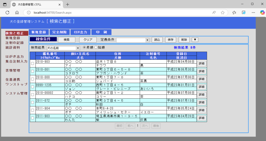 記録を検索した結果はこのように表示されます。観察番号、飼い主のお名前、住所、犬種などが一覧で表示されるので判別しやすくなっています。