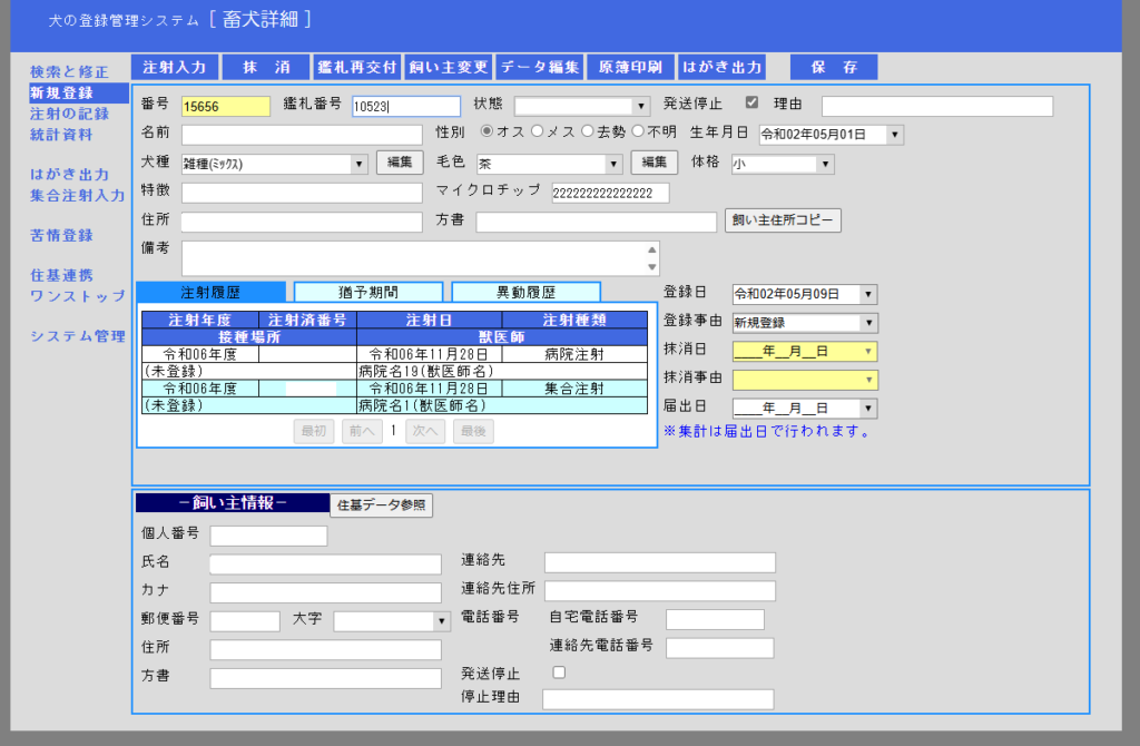 飼い犬情報となるマイクロチップ番号を入力する登録欄は実装済みで、今後環境省からダウンロードしたマイクロチップ情報のCSVデータを取り込んで登録されている飼い犬情報の更新、新規登録、情報の抹消等を可能にする機能の実装を予定しています。
