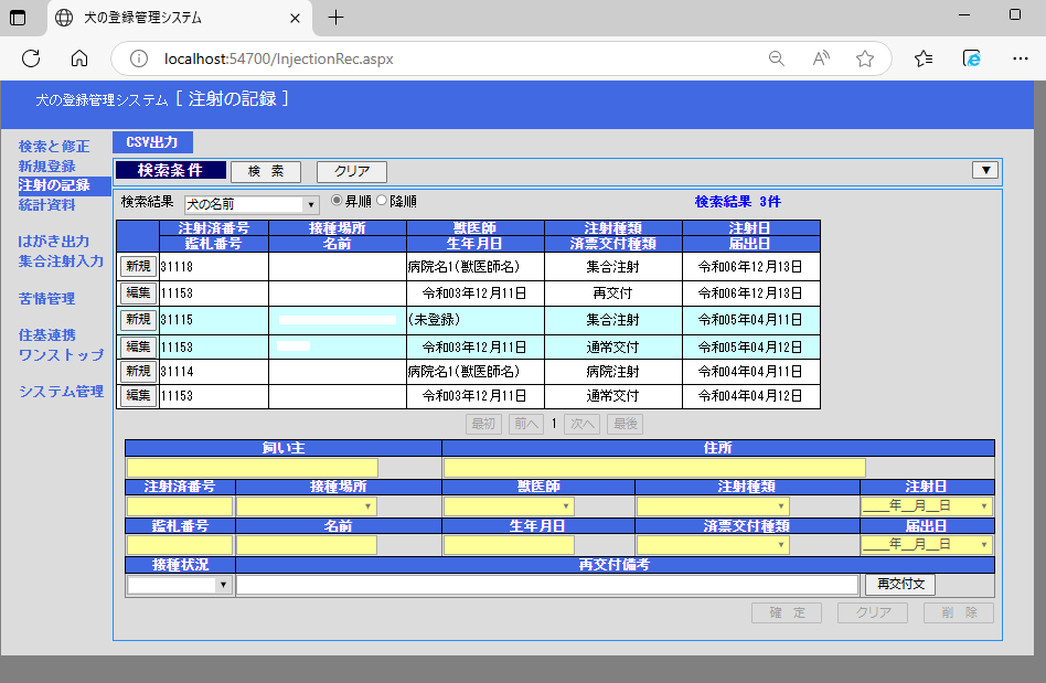 予防注射の記録の検索結果はこのように表示されます。こちらの表示から直接、新たな情報の登録や編集などが行えます。