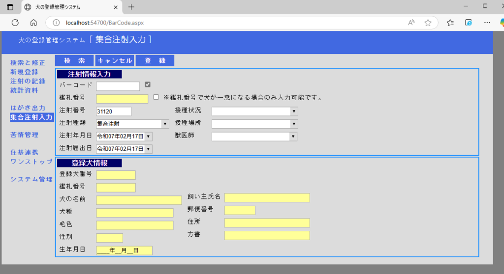 | 15 | (注射済犬一覧) | 現年度、予防注射を受けた犬を一覧表示します。 | ||