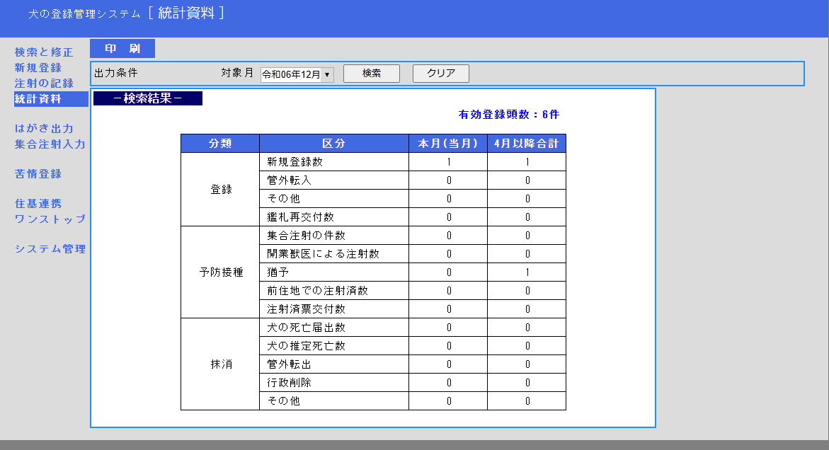 | 23 | 統計資料 | 登録状況送付書 | 犬の登録・注射の状況を指定月ごとに集計し、画面で確認するか、または印刷します。 | |