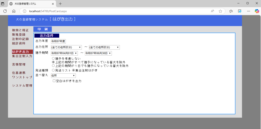 | 22 | 申請はがきの印刷 | 未接種犬および、無記名の申請はがきを印刷します。 | プリンタへ直接出力するほか、PDF 文書ファイル形式で保存することができます。 | |