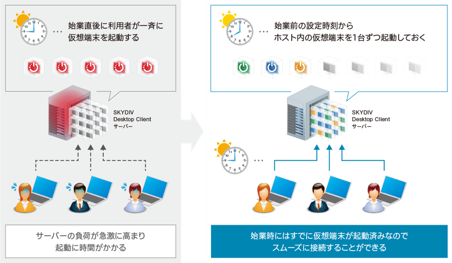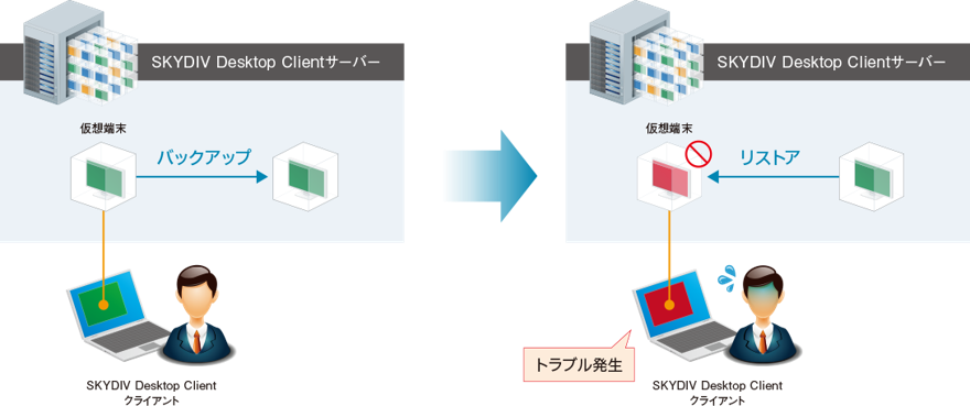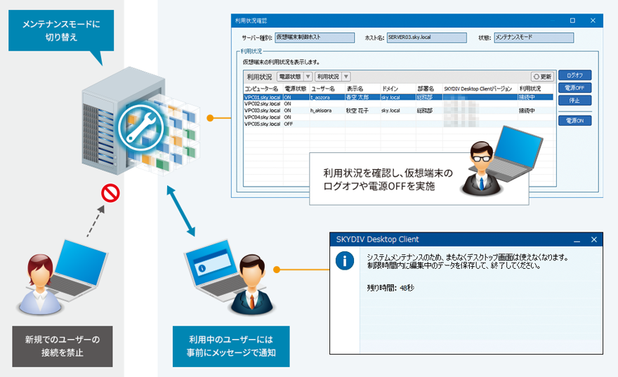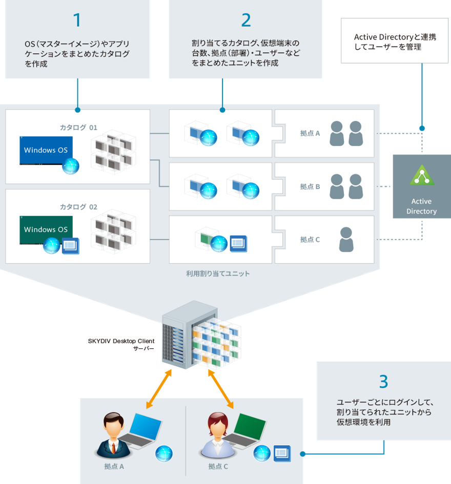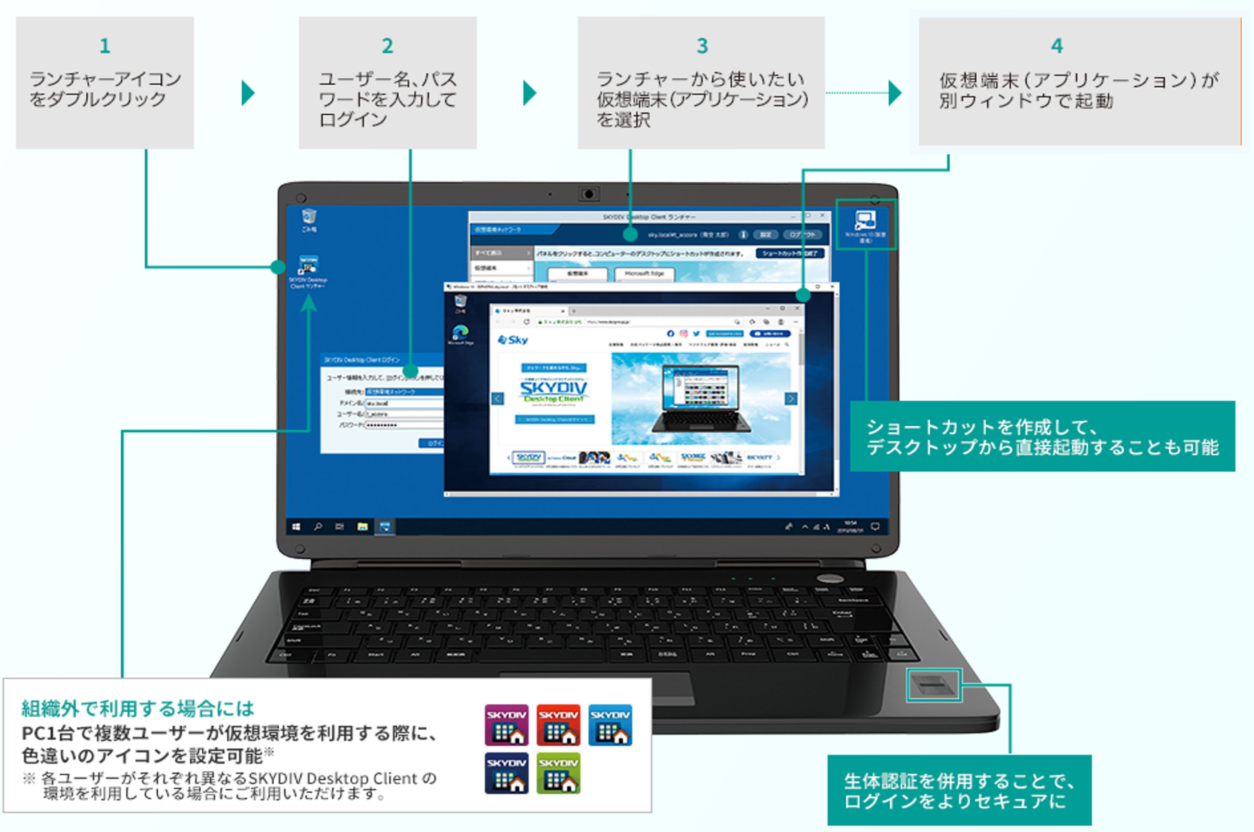 SKYDIV Desktop Clientは、仮想デスクトップ(デスクトップ仮想方式、アプリケーション仮想方式)によるネットワークの分離/ 分割を行うシンクライアントシステムソフトウェアです。