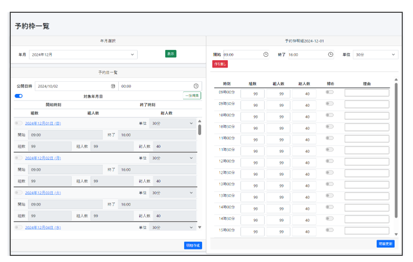 • 時間割・枠毎の受付人数・予約クローズ枠などを月毎に設定