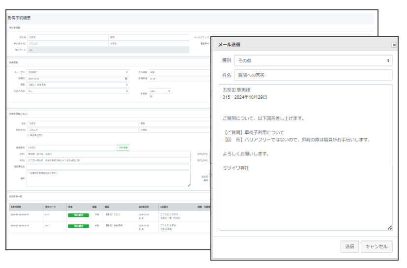 予約内容の確認画面から直接メールにて回答(返信)することができます。