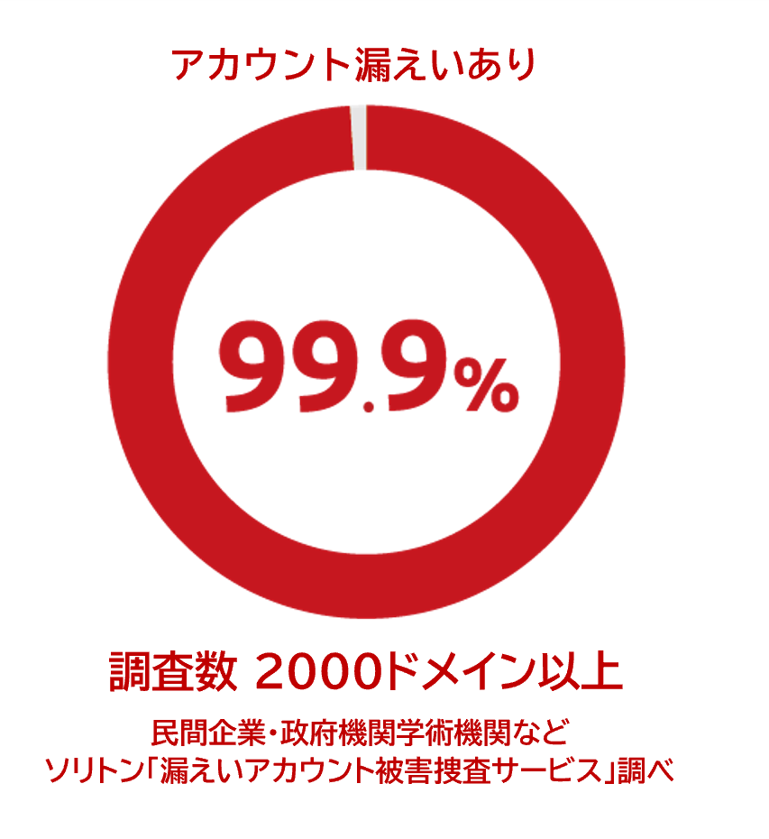 ソリトンシステムズ社がこれまでに行った「漏えいアカウント被害調査」によれば、調査を実施した99.9%(ドメインベース)の企業・団体で、現職職員のパスワードを含むアカウント情報の漏えいが確認されています。
