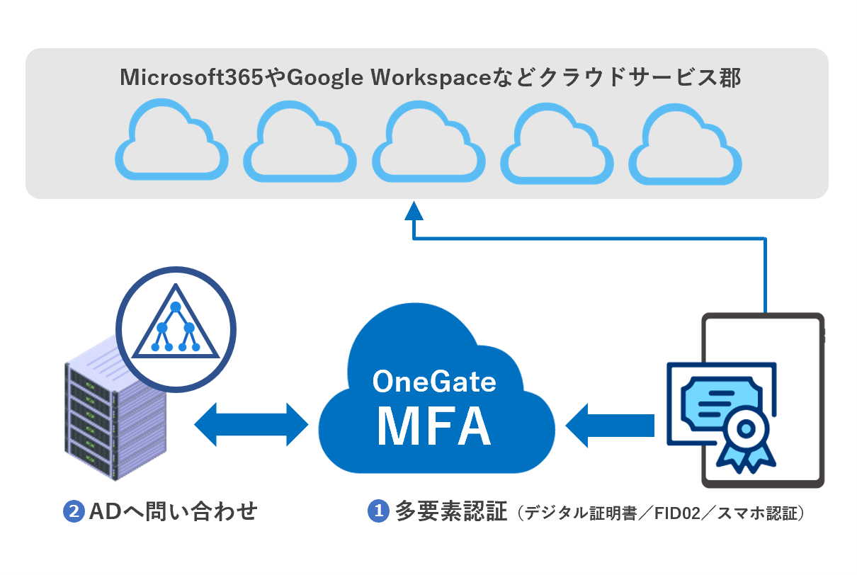 SASE や Microsoft 365、Google Workspace をはじめとする様々なクラウドサービスに、デジタル証明書+FIDO2/スマホ認証/パスワード/ICカードによる多要素認証(MFA)を手早く適用できます。なりすましを防ぐデジタル証明書なら、情報資産へのアクセスを、信頼できるユーザーとデバイスに限定することができます。