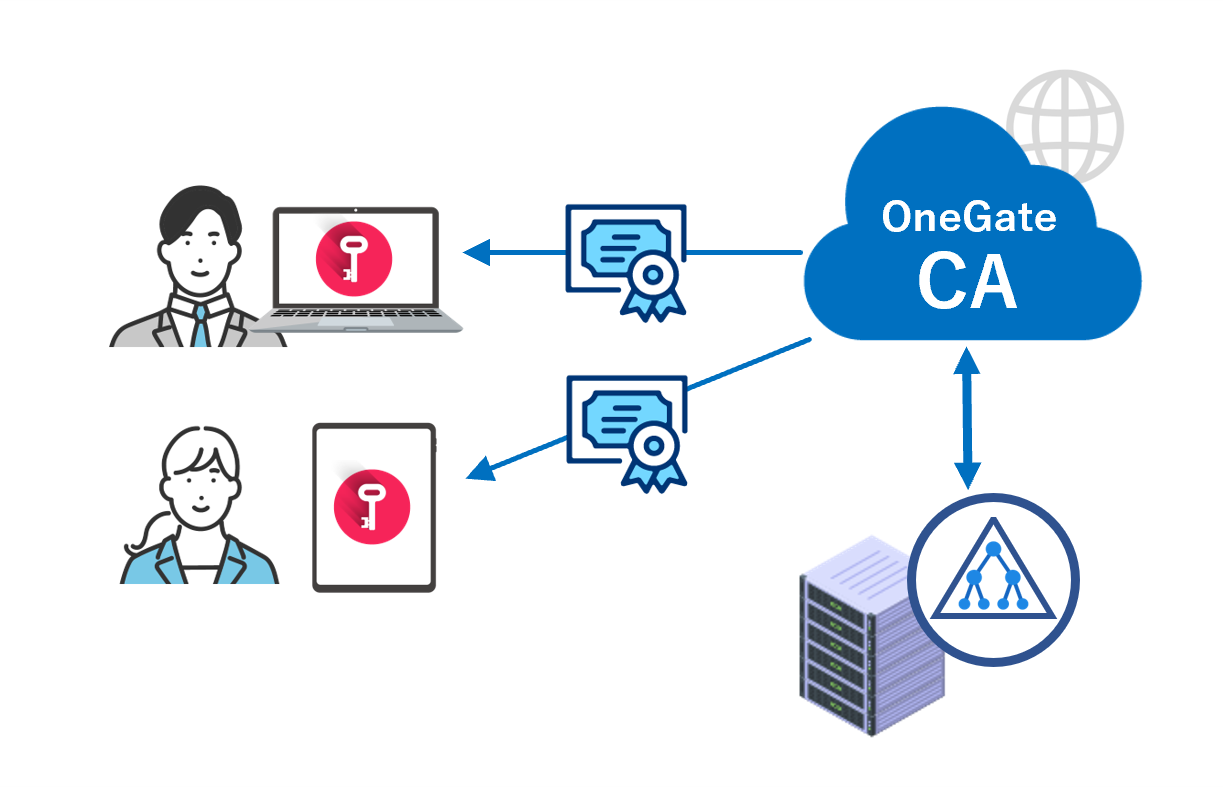 CA機能(認証局)を標準搭載したSoliton OneGateなら、業務システム利用時の成りすまし防止だけなく、オフィスWi-FiやVPNなどネットワーク認証も、手早く統合管理できます。