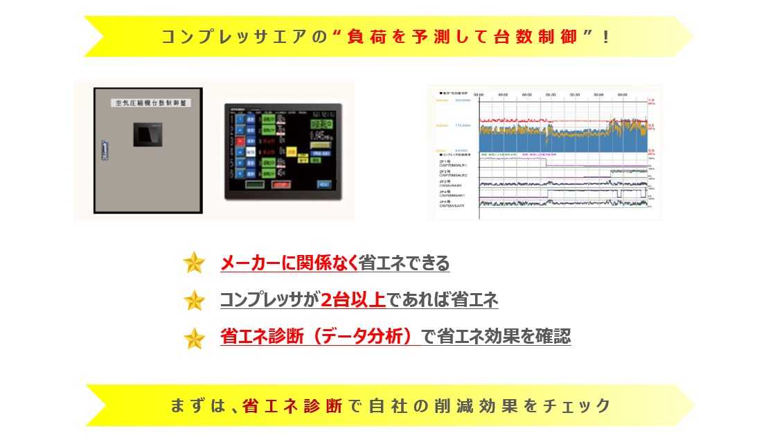 空気圧縮機の一般的な省エネ手法は、台数制御盤やインバーター・コンプレッサの導入、エア漏れの削減、低圧力化などがあげられますが、未対応の場合や既に台数制御盤を導入済みの場合でも 3~15% の更なる省エネが可能です。