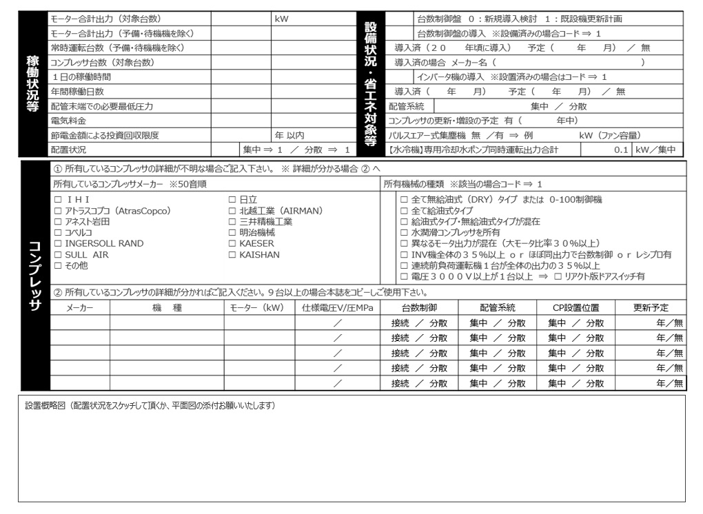 レシプロ、スシクリュー、オイルフリー、インバータなど、導入されているコンプレッサの