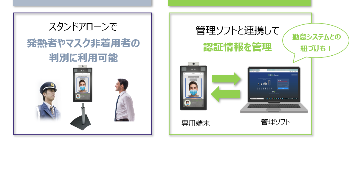 AIによる画像認識機能を活用した顔認証デバイス。個人の識別はもちろん、ニューノーマルに対応した非接触型で異常体温やマスク着用の有無を検知します。