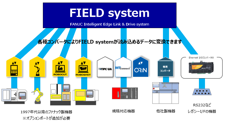 FIELD systemは様々な機器とネットワーク上で接続し、収集したデータを効率的に処理活用し、スマートファクトリーの実現を推進します。