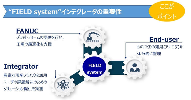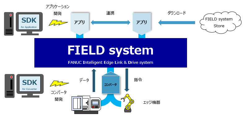 ファナック株式会社のIoTプラットフォーム「FIELD system」のFIELDは、FANUC Intelligent Edge Link & Driveを意味しており、「かしこく・つながる・動かす@現場」を実現したいという思いが込められています。