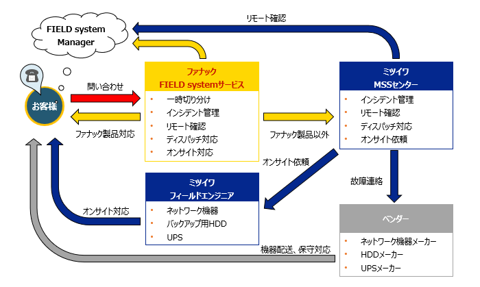 FIELD systemのトータルインテグレーションパートナーであるミツイワが、トラブルが発生した際にサポートします。
