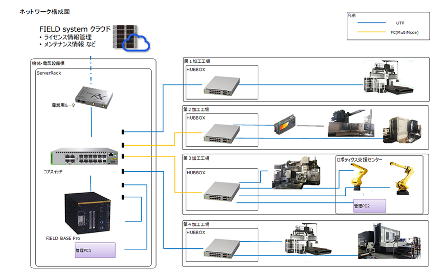 ヤナギハラメカックス様の本社工場の敷地内には4つの工場があり、工作機械 15台とロボット 12台が稼働しており、今回FIELD systemに接続したのは 工作機械 6台とロボット 2台の合計 8台です。残りの工作機械の多くは古く、接続には手間とコストがかかるため、いったん見送りにしました。
