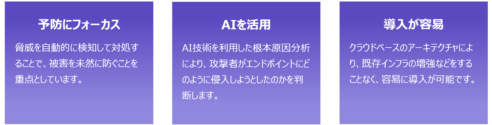 CylanceOPTICS®は端末上のイベントをモニタリングしたうえで、脅威の可視化、分析、調査、そして迅速な対応を実現するEDR機能を提供します。