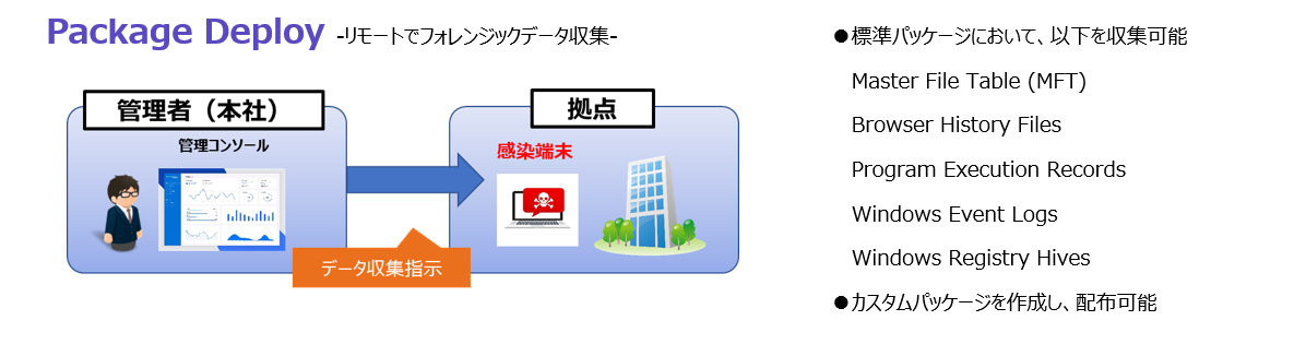 マルウェアに感染したエンドポイントから、フォレンジックデータの収集を管理コンソールから迅速に行うことができます。