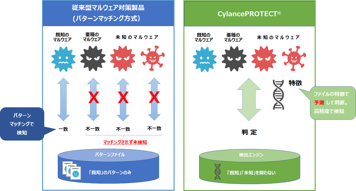 パターンマッチング型のマルウェア対策製品は、新種のマルウェアが登場してからパターンファイルが作成・適用されるまでにタイムラグがあり、その間にマルウェアに感染してしまう危険性がありました。その一方で、CylancePROTECT®はパターンファイルに頼らない検知方式のため、マルウェアの実行前に検知が可能です。また、オフライン環境や出張先でもご利用いただけます。