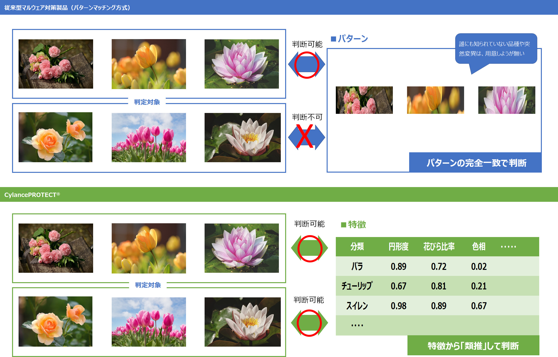 パターンの一致で判断させるのではなく、特徴から類推して未知のマルウェアも判断できます。