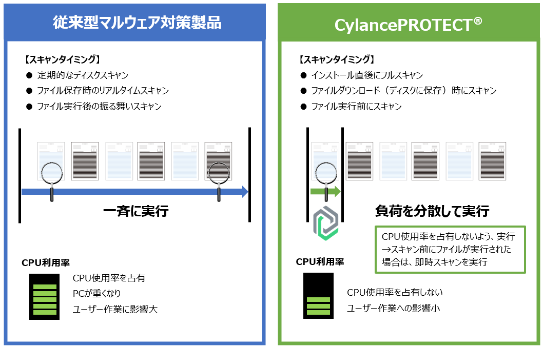 CylancePROTECT®はファイルスキャン時にも、CPU使用率を占有しないように負荷を分散してスキャンを実行します。そのため、スキャン中はPCの挙動が重くなるといったこともありません。