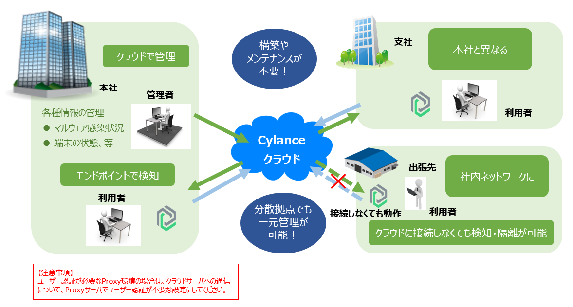 従来のパターンマッチング型のマルウェア対策製品の場合、オンプレミスに管理サーバーを用意する必要がありました。CylancePROTECT®はクラウド上に管理コンソールが用意されているため、管理サーバーの構築や維持・管理の必要もなく、運用コストを低減させることができます。