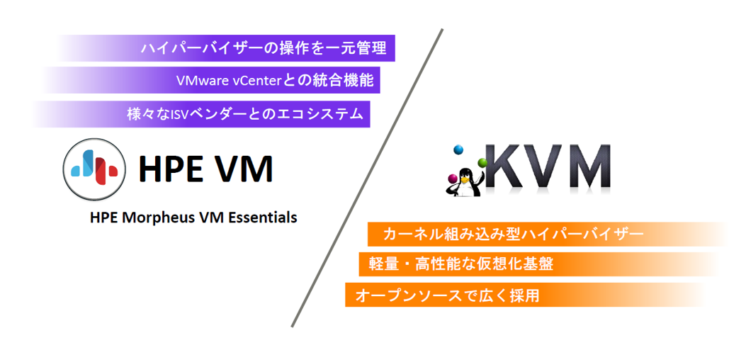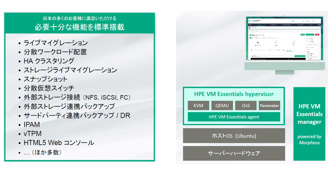 HPE Morpheus VM Essentials Software(VM Essentials)は、パブリッククラウドのデファクトスタンダードであるKVMハイパーバイザーをベースにした仮想化ソリューションです。