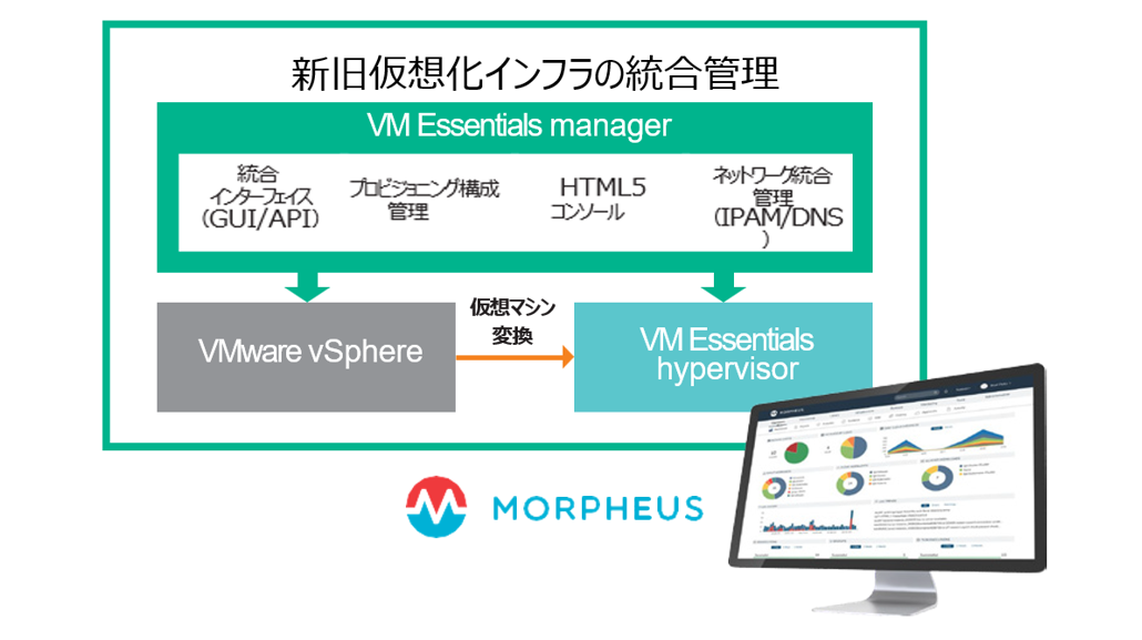 VM Essentials が標準・無償で提供する「VM Essentials manager」は、実績あるMorpheus PlatformOps のテクノロジーを応用することで、VMwareとVM Essentials の統合管理・プロビジョニングを実現しています。