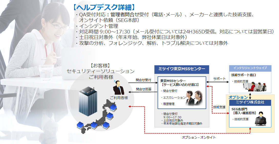 ミツイワの東京MSSセンターでは、Morphisecをご導入いただいたお客様からのお問合せの受付、異常検知時のメールの受付、お客様や技術者へのエスカレーションを実施するサポートサービスもご提供(有償)していますので、システムの運営を心配することなく安心してご利用いただけます。