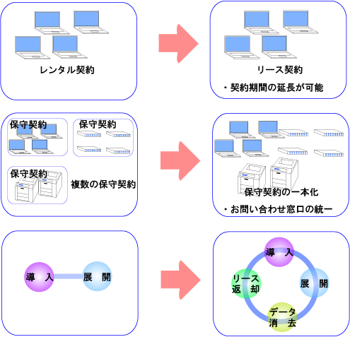 PCの導入・展開、既存PCのデータ消去・リース返却までを一環して行い、複数の保守窓口を一本化。