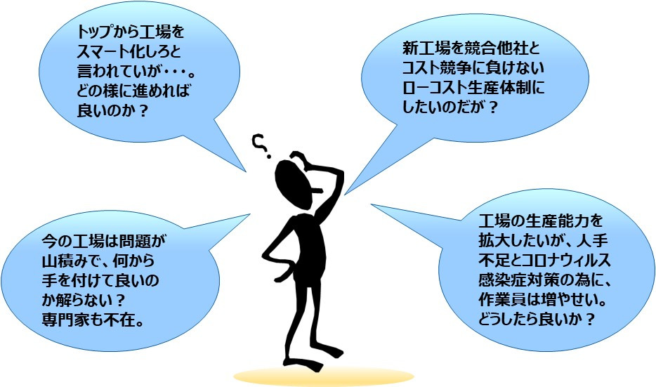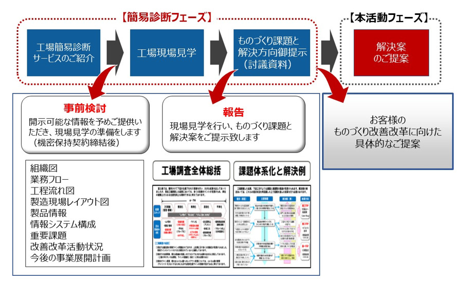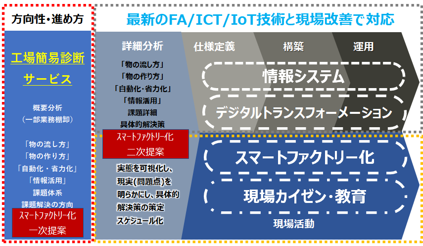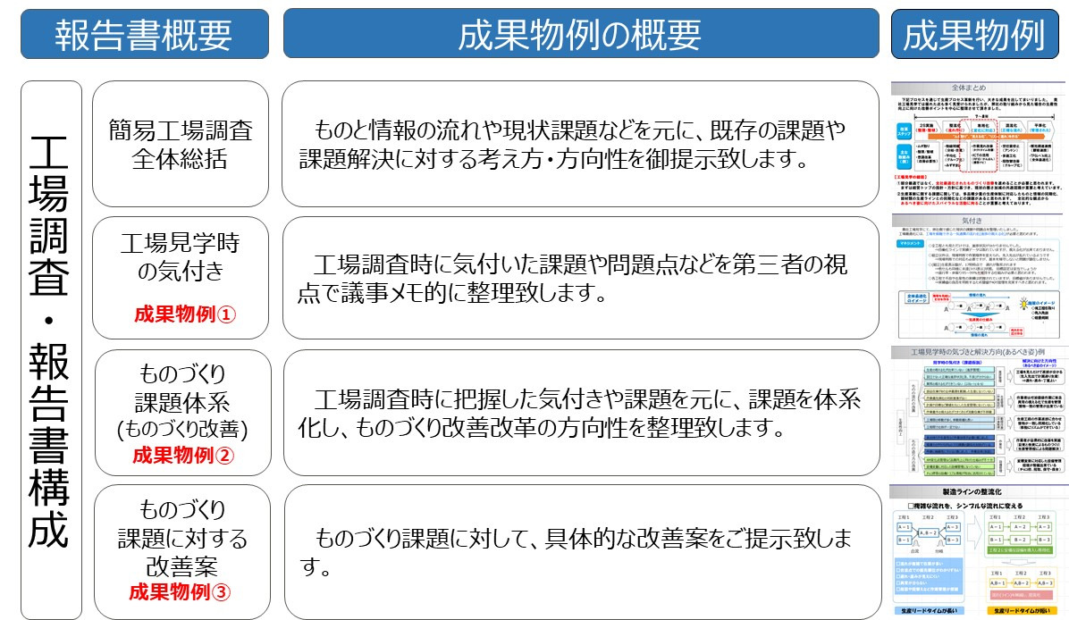 短時間の生産現場の見学から、生産現場の「ものづくりのスマート化」に向けた課題解決策と方向性を提示させていただくサービスです。