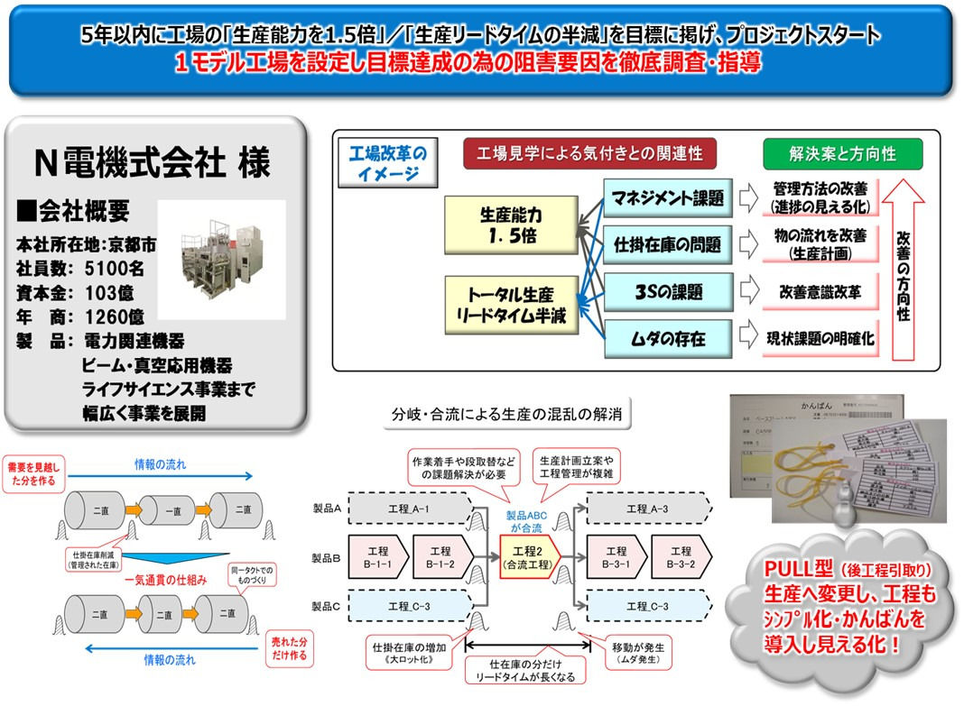 具体的には、(1)生産方式をPUSH型(押込み)からPULL型(後工程引取り)に変更し、物の同期化を図り工程内に溢れていた 在庫を大幅に圧縮致しました。 次に(2)分岐・合流で構成されている工程を安価な設備等も導入し、極力一直なシンプルな流れ(ライン)に変更し、遅れ・進みが見え易い工程としました。 更に(3)補助部材の管理に「かんばん」を導入し、在庫を切らさず必要最低限の補充発注の簡略化と適正在庫となる仕組みに変えました。 お客様では、現在も中期計画の達成に向け活動推進中です。